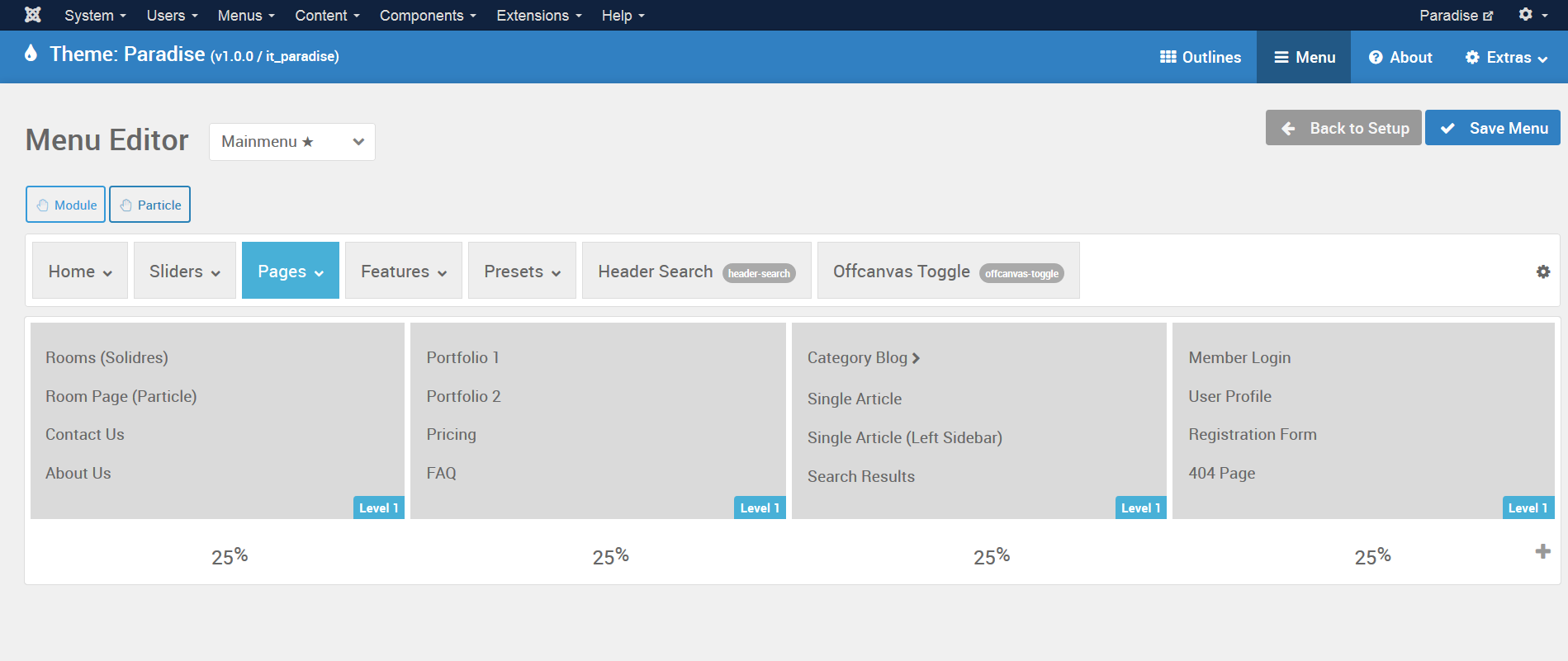 Gantry 5 features an advanced and user friendly Menu Editor, which augments the core menu with a rich, drag and drop enhanced interface, to easily change the menu's frontend appearance, such as columns.