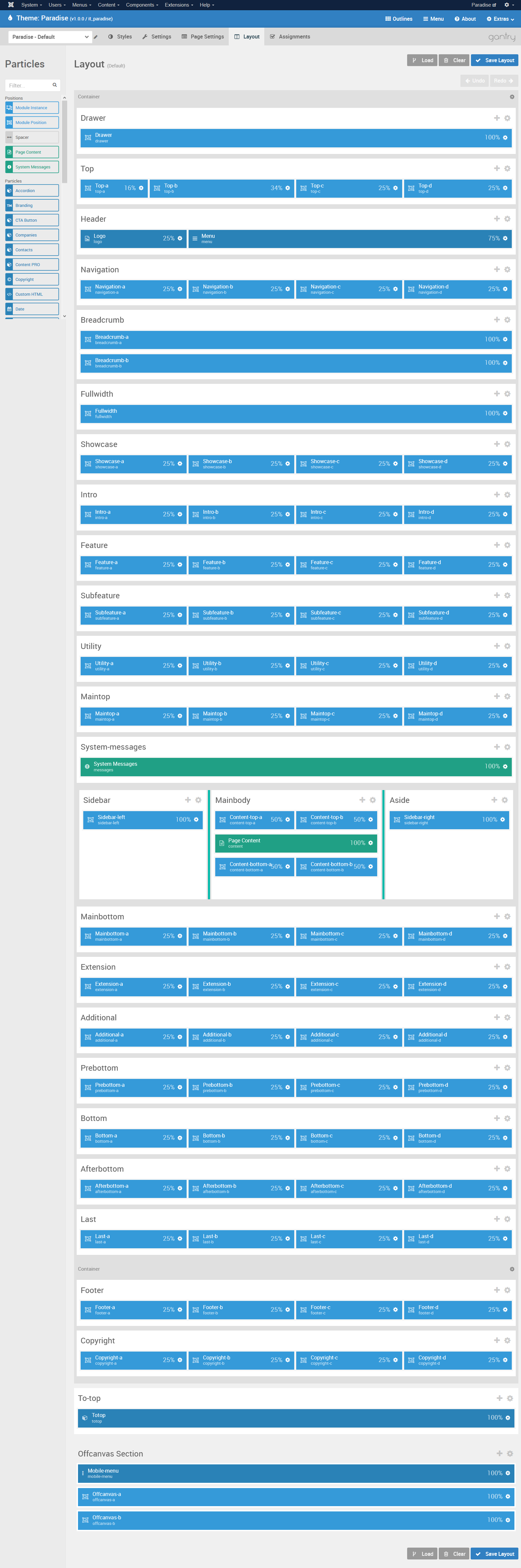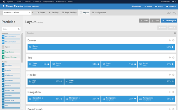 Gantry 5's layout manager benefits from a drag and drop interface, providing an easy mechanism for adding, removing, configuring, moving and re-sizing positions and particles.